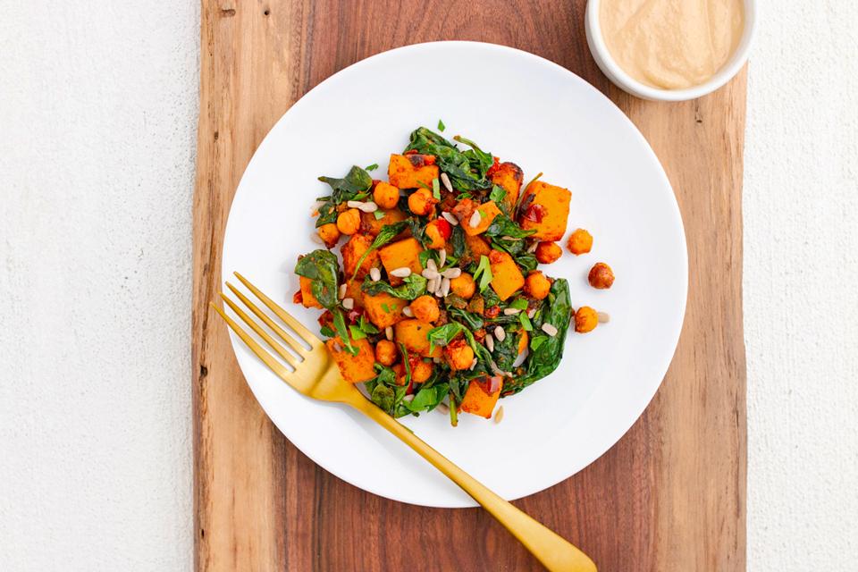 A zesty, nutritious breakfast that gets its kick from cumin and coriander. A drizzle of our spiced tahini dressing adds a zing to the tangle of potassium-rich potatoes, chickpeas and spinach.