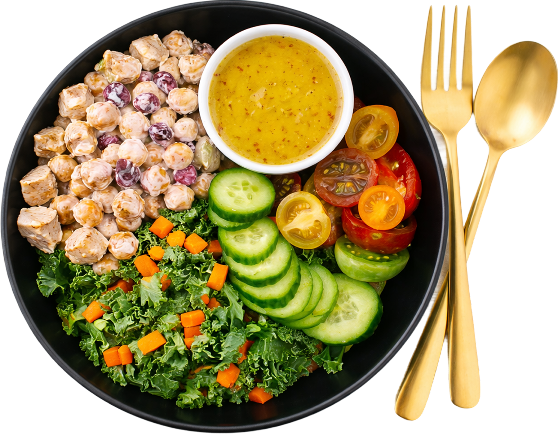 A hearty, nutrient-packed dish featuring finely chopped kale tossed with tender chickpeas and crisp vegetables for a satisfying bite. A bright vinaigrette ties everything together, balancing the earthy greens and nutty legumes with fresh, zesty flavor.