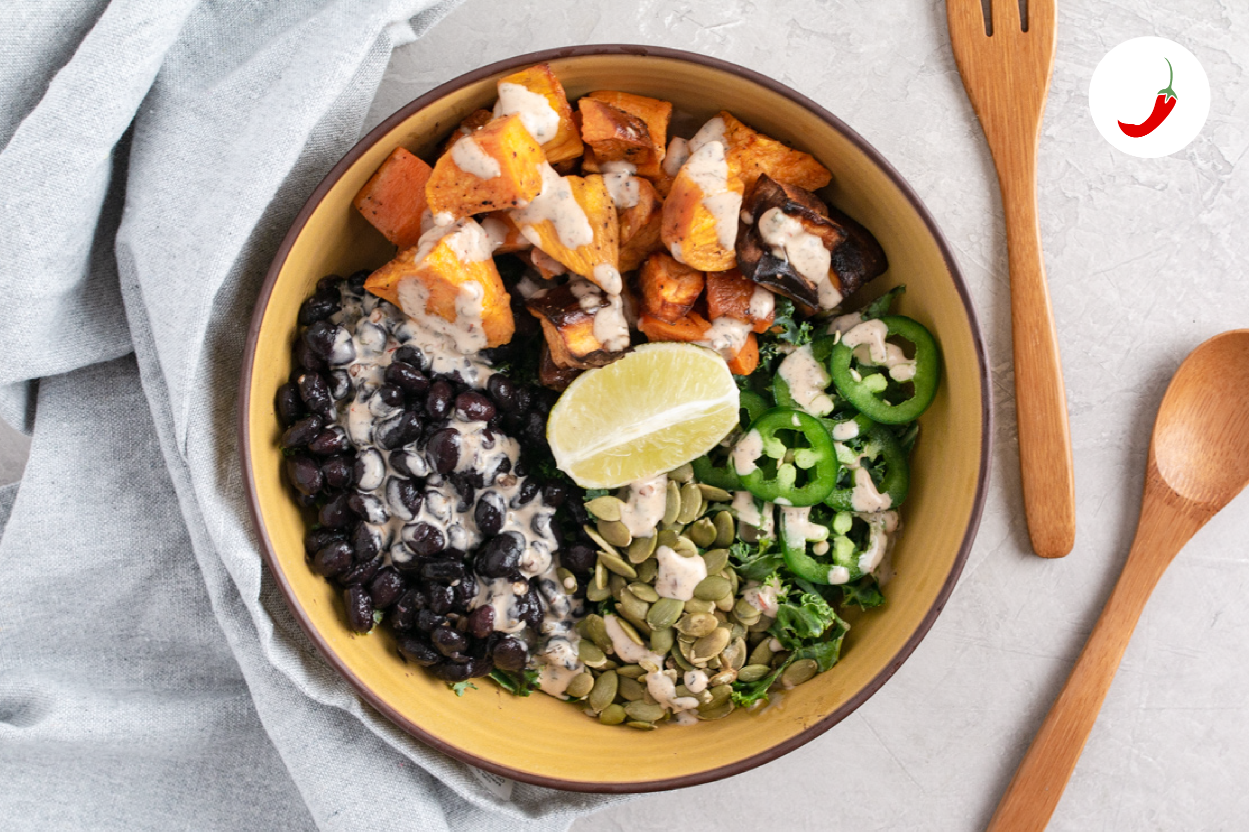 A hearty bowl brimming with flavor and vitamins. Sweet potatoes are rich in vitamins A + C, fiber, and antioxidants. Black beans are a good source of protein and B vitamins.