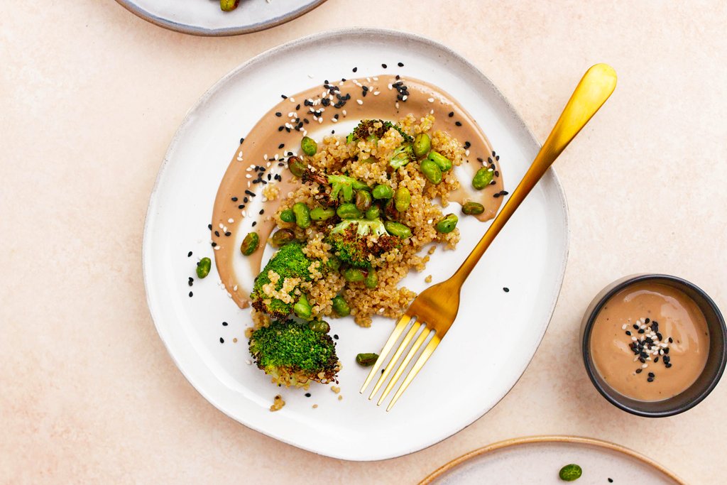 This sweet sesame broccoli is a protein-rich, plant-based dish that supports muscle health and sustained energy, thanks to tofu, edamame, and quinoa. Packed with greens and seeds, it also provides fiber and essential nutrients to support digestion and overall wellness.